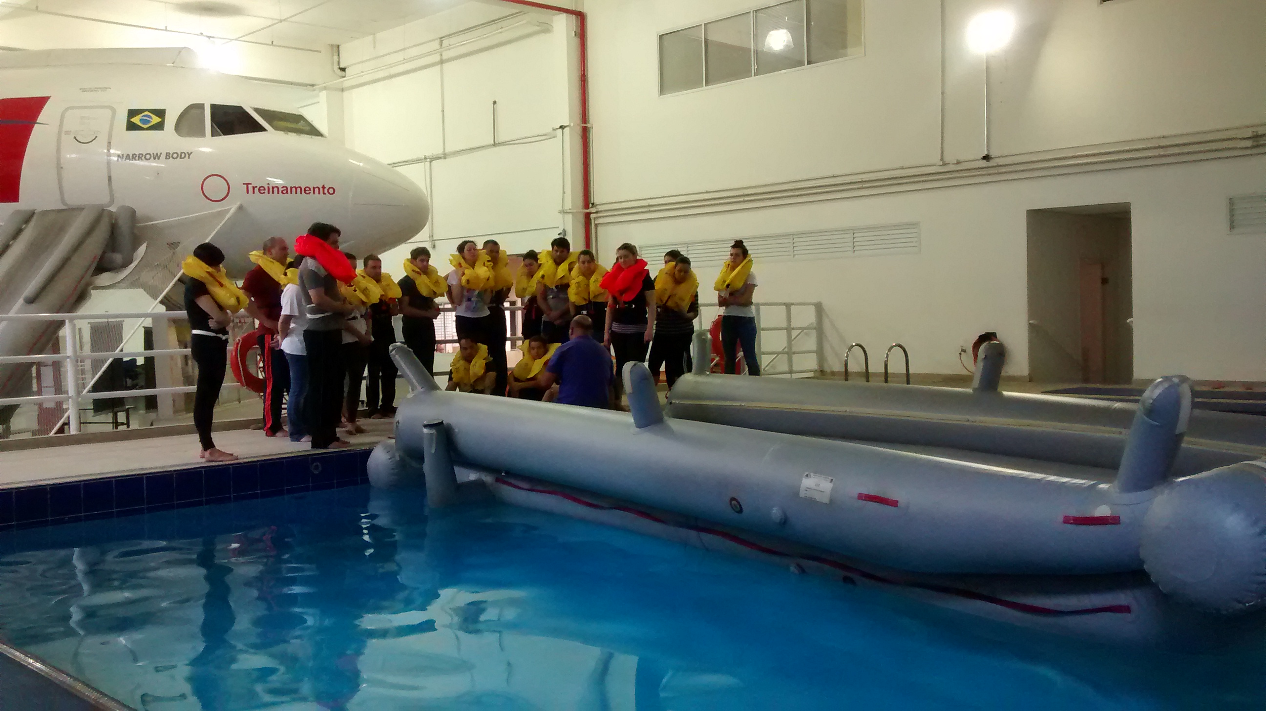 Há ainda outras simulações, como o pouso na água. Em uma piscina, os comissários repassam as técnicas para desprender o bote do avião, revisam a melhor forma de acomodar um grande número de pessoas, relembram como se movimentar na água.