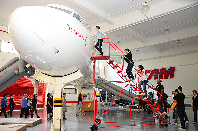 Todos descem do avião pelo tobogã, para em seguida subir novamente e treinar uma situação emergencial diferente. Detalhe: nenhum dos comissários em treinamento sabe de antemão qual será a situação apresentada. A definição é feita pelos instrutores para ser uma surpresa também para os funcionários, que têm de saber como agir.